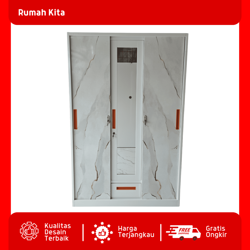Spesifikasi Produk : Merk : DJTech Tipe : Lemari Besi 3 Pintu Ukuran : 120 cm Material : Besi full coating anti karat Warna : Putih